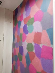 この壁です。アイカさんの商品でメラミン化粧板です。刺繍のような手触りで建材の中でこのような仕上がりのものはありません。本当にきれいです。