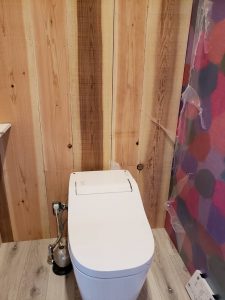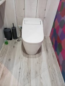 仕上がるとこんな感じです。フローリングはお客さんの指定でそれに合わせて壁の色もアンティークな仕上げにしました。完成してからお客様のトイレを訪問に行くと