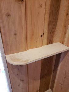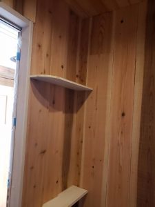 反対の壁はこのように棚をつけて板で仕上げました。反対の壁にかなりのインパクトがあるので仕上げ的には普通の仕上げにしました。クロスでも良いのですがお客様の要望でクロスは使わず杉板と天井は桧の羽目板で仕上げました。