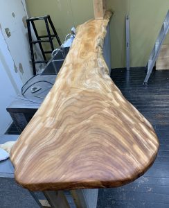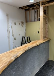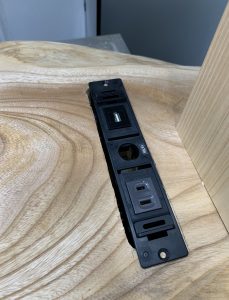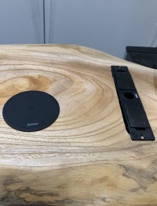 カウンターに欅の一枚板が手に入った事で大きな目玉となりました。他にはカウンターにUSBポートがあり生活必需品の携帯電話の充電ができるようにした事、そしてそれが置くだけでできるスガツネ工業さんの置くだけ充電機が好評でした。
